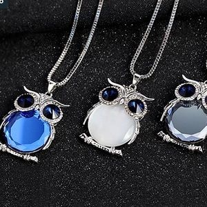 Owl Crystal Rhinestone Brilliant Blue Necklace. Sparkling Rhinstone and Crystal Owl perched on a branch. Substantial size & chunky piece. This will get lots of compliments& attention. New NWT - Boutique. Crystal faceted Brilliant Blue Body & Eyes w sparkling Rhinestones. Open cut back allow light through for ultimate sparkle & shine, Silver-plated Alloy Herringbone style 14” Chain w lobster Claw Clasp, Branch/other silver parts. Well made -chunky w good weight See picture for measurements.