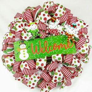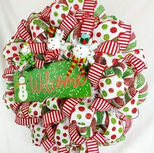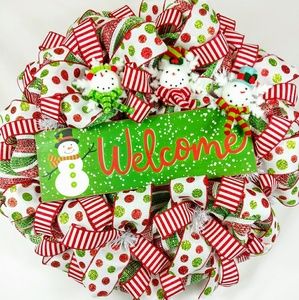 This Super Cute Christmas Wreath Design includes one full 21" Christmas themed quality poly deco mesh in 12" poofs on a Large Work Wreath Form with two different Christmas themed wired ribbon designs and three cute snowmen on a snowflake, topped with a super cute Snowman Christmas Welcome Sign. Handmade from the Heart.
