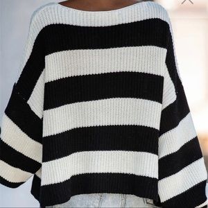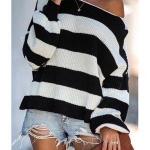 Slide stylishly into fall with this super trendy off the shoulder chunky knit sweater. Classic black and white thick stripes and perfect staple sweater for fall and on through the winter months to come! Features off-shoulder, oversized, bell sleeves.