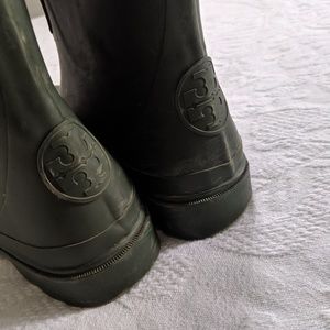 Cute combat boots look! Boots are an olive green rubber, gold hardware and brown leather straps. Excellent condition, a few minor scuffs.