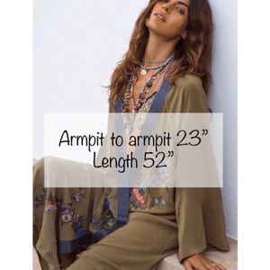 Brand new. Lightweight & soft! Olive green w/vibrant blue & pink floral embroidery. Long maxi length, wide bell sleeves, open front.