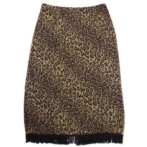 Lennie for Nina Leonard Midi Skirt. Leopard print knit. Brown knit fringe at hem. Elastic waistband. Slit in back. Gently used. Would look great with a pair of boots. 100% Acrylic. Women's size Large.
