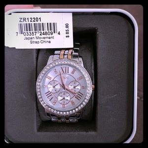 Silver and rose gold with crystal face. Really pretty in person. Battery works and no major scratches or marks on it.