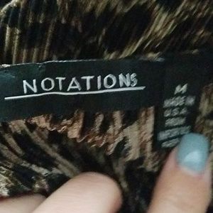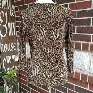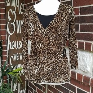 Notations leopard v- neckline faux wrap with detailed buckle blouse top. Has an attached scoop neckline black half cami. Preowned no flaws