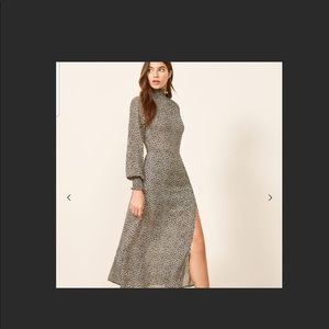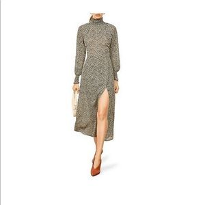 A Romantic midi length, turtleneck dress with a button front skirt and long sleeves. Dress is slim fitting throughout.