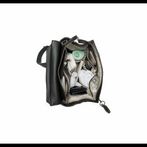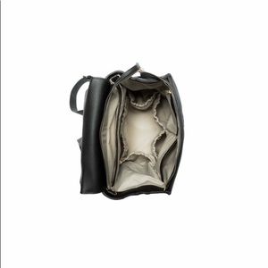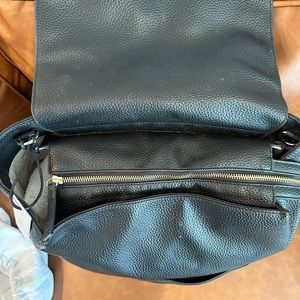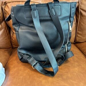 Beautiful vegan leather diaper bag. Black. EUC with tags. Just needs a good wipe down. Comes with cross body strap and stroller straps and original dust bag. Some wear on handle and fading of logo on front - see photos.