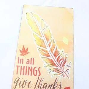 Cute metal sign with a fall theme - raised feather and words "in all things, give thanks"
