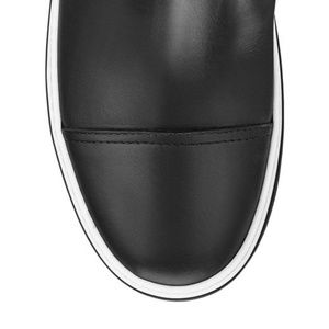 Completely new with the box and two dustbags, the Jimmy Choo Bury Flat is a winter boot built on the same construction as a trainer. Bury is extremely luxurious with a black leather upper and fur running all over the leg of the boot. Shearling fur lines the toe and insole for the comfort and heat. Made in Italy. The boots come in EUR size 37 - approximately US 7. PLEASE KNOW YOUR DESIGNER FIT. Bought them at Saks and never wore them.