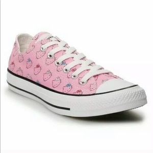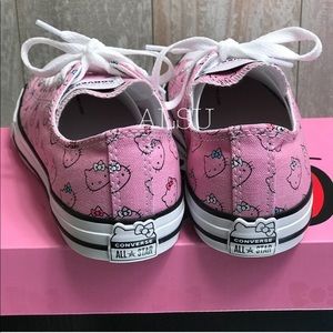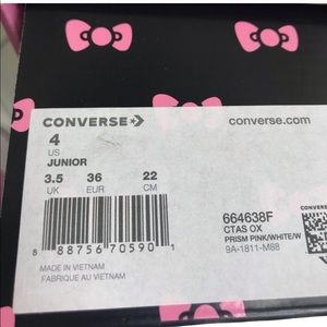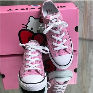 Brand new with box. Price is firm! No trades. Say hello to sweet style. Hello Kitty teams up with Converse to bring you a shoe that shows off the classic Chuck Taylor look and the iconic pop culture designs of Hello Kitty. The canvas upper features screen printed Hello Kitty graphics, and the White lining is an additional fun detail.