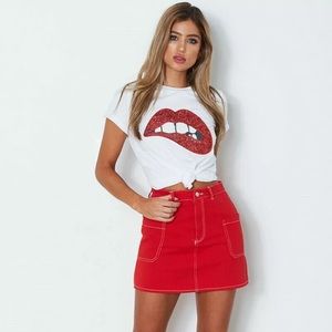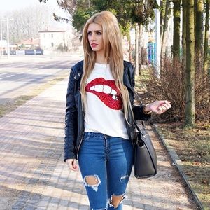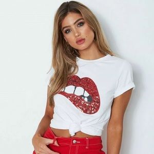 Swirl and twirl through your day with the Bite Your Lip Tee! The lip print is made of sequins so it's not just your typical plain white tee. Perfect with jeans and shades for lunch or cropped pants and flats as you buzz about the city.