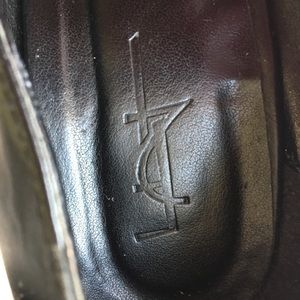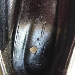 There are a couple of light scratches on the toe of the right shoe and some light wear spots on the heels. The interior of the Right shoe has a small spot where the black of the footpad was peeled off