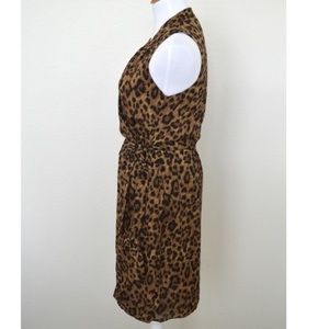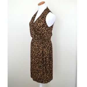 Michael Kors leopard animal print faux wrap dress, size 4. Brown and black, sleeveless, v-neck, fully lined. Silk material. Elastic waist. Measurements laying flat: Bust (armpit to armpit): 18" Waist: 14" stretches to approx 18" Hips: approx 20" Total length (top of shoulder to bottom hem): 38"