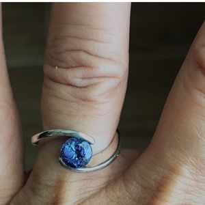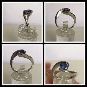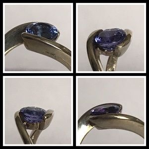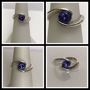 Genuine natural AAA quality 5mm round faceted tanzanite set in a sleek, unique 925 setting. It is hallmarked 925 Rl. Size 6 1/4. The tanzanite is a dark blue color with a hint of purple. You will love this ring