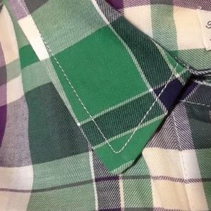 Nice, NWT button-up shirt by Madewell's Broadway & Broome, (sales tag says "Madewell"), size S. Purple, green, cream and white cotton plaid. Long sleeves. Front chest pocket. 24" long in front, 26" long in back. 19" pit-to-pit. New condition. Super nice!