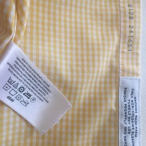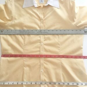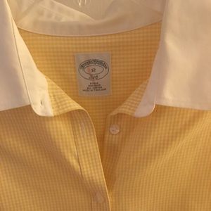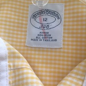 (Item appears to be never worn). Brooks Brothers 346 No-iron White and Yellow checkered shirt button-up blouse Size 12. White crisp collar and cuffs. Measurements shown in photos for you. Fitted style, all cotton, tag red mark. CUTE! Other shirt listed soon different size (4). Unique coloring.