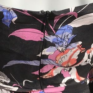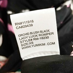 DESCRIPTION: Yumi Kim lady luck romper in orchid blush black print. Black background with a orchid floral print. 100% silk with 100% polyester lining.