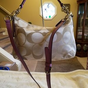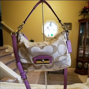 💜Kristin E/W Crossbody bag from my own personal closet. Gorgeous 💜French Lilac Leather on all trim, pull, handtag, short & long strap. Light tan with Light brown Sateen bag. Top zip is perfect. Inside: A full zip & 2 pockets. 🚫NO stains, 🚫NO Wear, inside or outside. All straps perfect. 🚫NO wear, & 🚫NO sealcoating off! Looks vault-kept & is