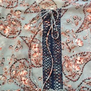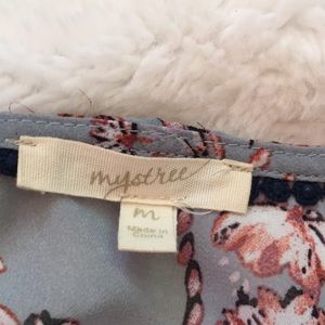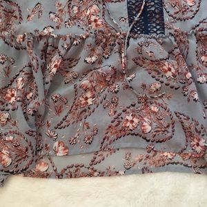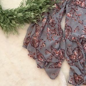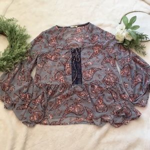 Size M gray floral print bell sleeve pull over top has a tie at the front neckline EUC