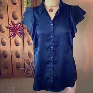 Nice navy button front blouse with flutter sleeves! Easy care 100% polyester. Measurements taken while lying flat & are approximately: 27” L shoulder to hem & 29” pit to pit. EUC!