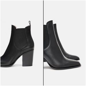 Zara woman black leather ankle boots. Contrasting pink lined interior. Elastic inserts at sides. Pull tab at heel. Wide heels. Height 3.5 inches Super cute and chic, sold out booties. ( small shell scuffs on left boot sz 37, see last picture)