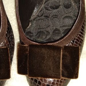 Exceptional pair shoes with vintage style look . Suede and snakeskin with velvet bow. Made in Italy. Quilted fabric inside foot bed. No scuffs or scratch. This shoes are always in style to dress up.