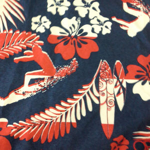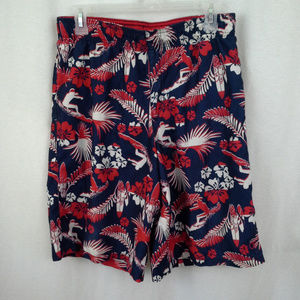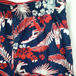 Op boys' swim trunks. Size 2XL (18). Surfers, Surfboards. Red white blue. Floral, hibiscus. 100% polyester. Polyester mesh lining. Hawaiian aloha style. Elastic waist. No pockets. Waist 30" (76 cm), inseam 11" (28 cm). Location 2699-eM. Non-smoking cat-friendly home.