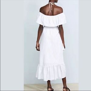 Arrive to brunch in style in this chic off-the-shoulder ruffle stripe dress. - Halter neck with tie details - Off-the-shoulder - Short sleeves - Elastic waist - Stripe print - Knit construction - Ruffle details - Lined - Asymmetric hem - Approx. 34" shortest length, 48" longest length (size S) - Shell: 65% cotton, 35% polyester Lining: 100% polyester Model's stats for sizing: - Height: 5'10" - Bust: 34" - Waist: 24"
