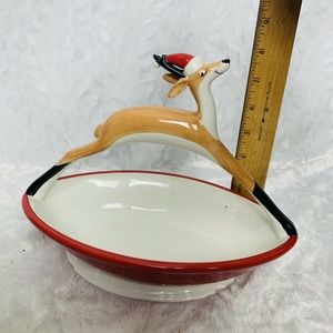 Dept 56 Reindeer Christmas Basket Ceramic DIsh 10x8 inch Handpainted Holidays Vintage