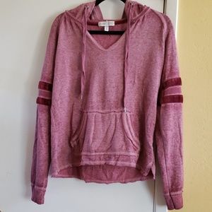 super comfy and soft raw edge hoodies provides a street casual attire. - Attached drawstring hood - V-neck - Long raglan sleeves with dual velvet stripes - Heathered knit construction - Kangaroo pocket - Split side seam.- color burgundy