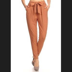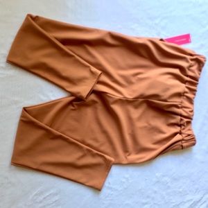 In new condition. They are stretchy, high waisted with pockets and front tie. Color is like a light brown brick color. If you want them tighter (like second model) then downsize and if you want them like first model then buy your true size. See my page for more listings. Don’t forget to bundle and save.