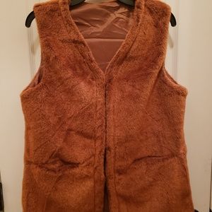Rust colored vest with inside lining. Vest can be worn open or does clip down as shown in last photo. This vest is trendy and stylish, all one size. Sorry I dont have any plus size of this one.