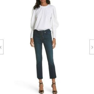 A lace-up fly and kicky cropped hems update a pair of jeans cut from Japanese stretch woven denim