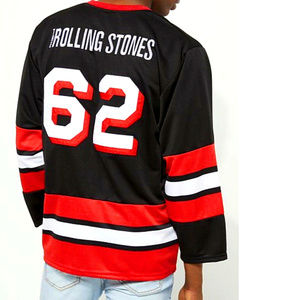 A long sleeve hockey jersey featuring Rolling Stones Tongue Logo on the chest and It's embroidery Logo image with stitched 62 digits on the back. Finished with the contrast stripes down front and back, and across sleeves. Cut from a breathable knit material. 100% Polyester.