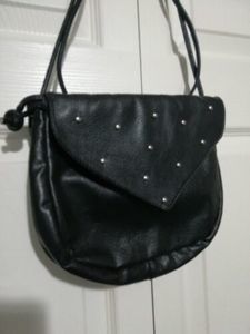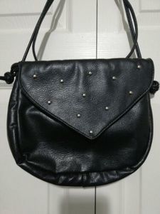 Leather cross-body bag have long crossbody strap the front is adorned with silver ball studs there's one zipper closure on the inside