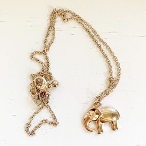 Vintage adorable rose gold tone metal elephant charm necklace. The necklace has a thin & dainty chain that measures 18.5 inches long (including a 2.5-inch extender) & has a lobster claw enclosure. The elephant charm measures .6 inches by .75 inches. Some normal wear with use, but in great condition!