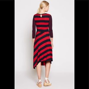A mash-up of vibrant stripes bring bold graphic twist to a fitted cotton jersey dress with an elegantly draped, faux-wrap skirt. - Back button-loop keyhole closure - Crewneck - Long sleeves - Unlined - 100% cotton - Hand wash, dry flat - Imported - Individualist.