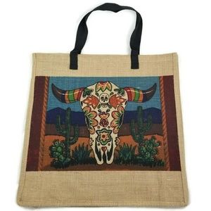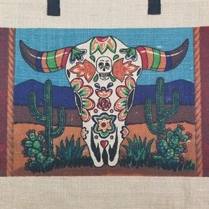 100% jute tote bag featuring a colorful cow skull on a desert scene. Measures approximately 18 1/2" by 18 1/2" and 4" deep. Approximate 8" strap drop. Coated interior. Very fun multi-use tote bag!