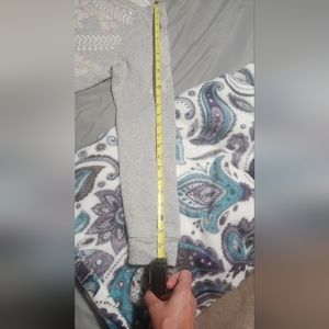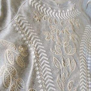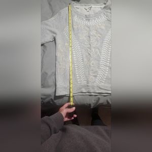 Super cute Lucky Brand Lotus embellished sweatshirt. Heather grey with cream and white detail. Great used condition. Sz small. Couple thread freys. Not coming apart, just where threads ended. See pics