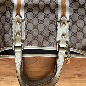 Great condition. Authentic. Only flaw is the leather parts have a little wear & the bottom corners of the bag have some wear on the canvas. Minor pilling on the stripe fabric piece.