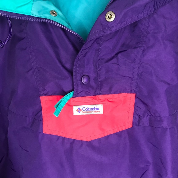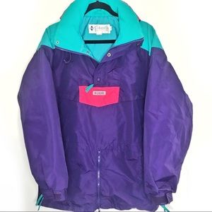 Vintage Columbia Jacket Purple blue and pink. Has a hidden hoodie. No discoloration. Zippers are all functional.