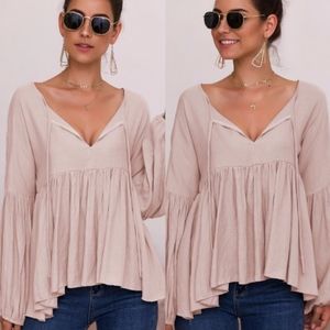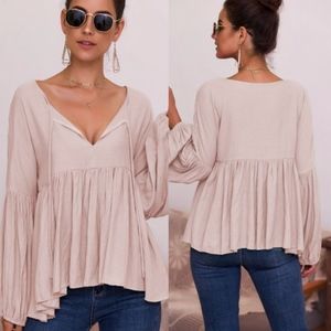 This Julia Long Sleeve Relax Top is perfect for mixing up your jeans and T-shirt look! Gauzy woven fabric falls from a front open with tie, into long balloon sleeves with elasticized cuffs. Relaxed, wide-cut bodice features puffy bottom start from waistline.
