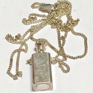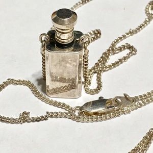 This is a solid silver Necklace (no markings) Bottle like Pendant is heavy and solid. Long chain