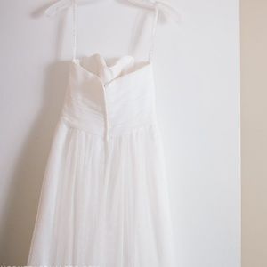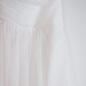 I am 5'2" and ordered a size 2 of this dress: https://www.davidsbridal.com/Product_swiss-dot-tulle-empire-waist-soft-wedding-gown-wg3438. I have the measurements between a 0 and 2 with a 32B chest - it has been altered for these specifications. There is a simple bustle. I wore flats w/ this dress so it's on the petite side. I am happy to take more pictures or send more measurements to help you with your decision!