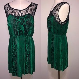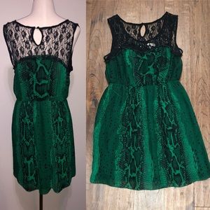 Faux snake print in green and black. Black lace and embellishments on chest area with 1 button back closure. Does not come with belt. You can easily use any black belt. Animal/ smoke free. This is a junior size 9. Can easily fit a Woman size smaller
