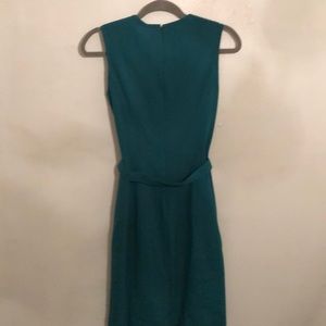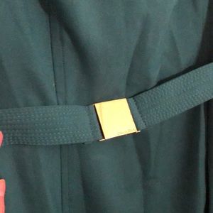 Calvin Klein emerald green midi professional dress with light wear and scuff in matching belt buckle.