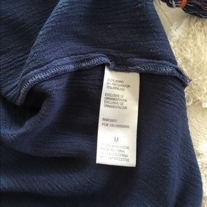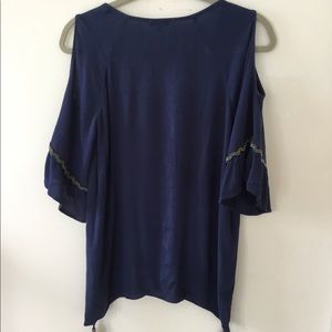 Democracy over blouse in a bright blue with cold shoulder. This blouse has embroidery down the front, on the neckline and on the sleeves. It also has 2 tassels on the front of the blouse. The sleeves have a bell effect to them and the sides end in a slight point.