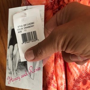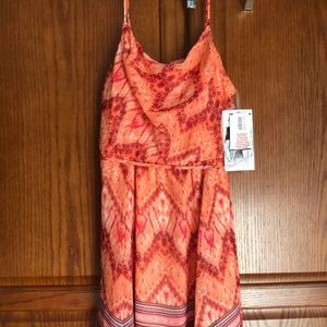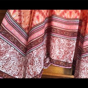 This Aztec designed dress/tunic is asymmetrical in the sides. Fun and flirty with vibrant oranges and burgundy colors. Absolute stunning on. There is a camisole underneath.