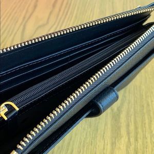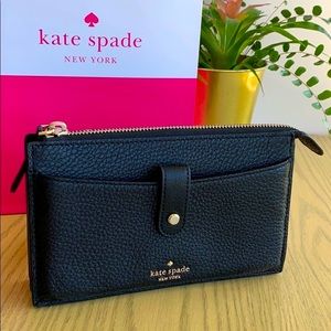 Kate spade small black crossbody bag. This minimal bag measures just 8 inches by 5 inches by 1 1/2 inches. It has a detachable strap so it can be used as a wallet or clutch. But don’t be fooled by the compact size. This elegant design features: