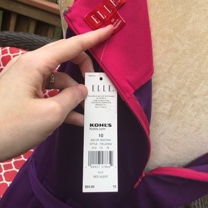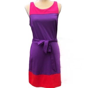 Beautiful purple, pink and red color block dress. New with tags. Has purple belt that can be worn in back or wrapped around in front. Please see photos for material composition. Size 10. Approximate measurements unstretched and laying flat: