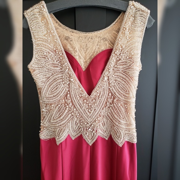 Beautiful cherry beaded dress . Round neck and open V back. Has Light padding and the zipper is on the right side.